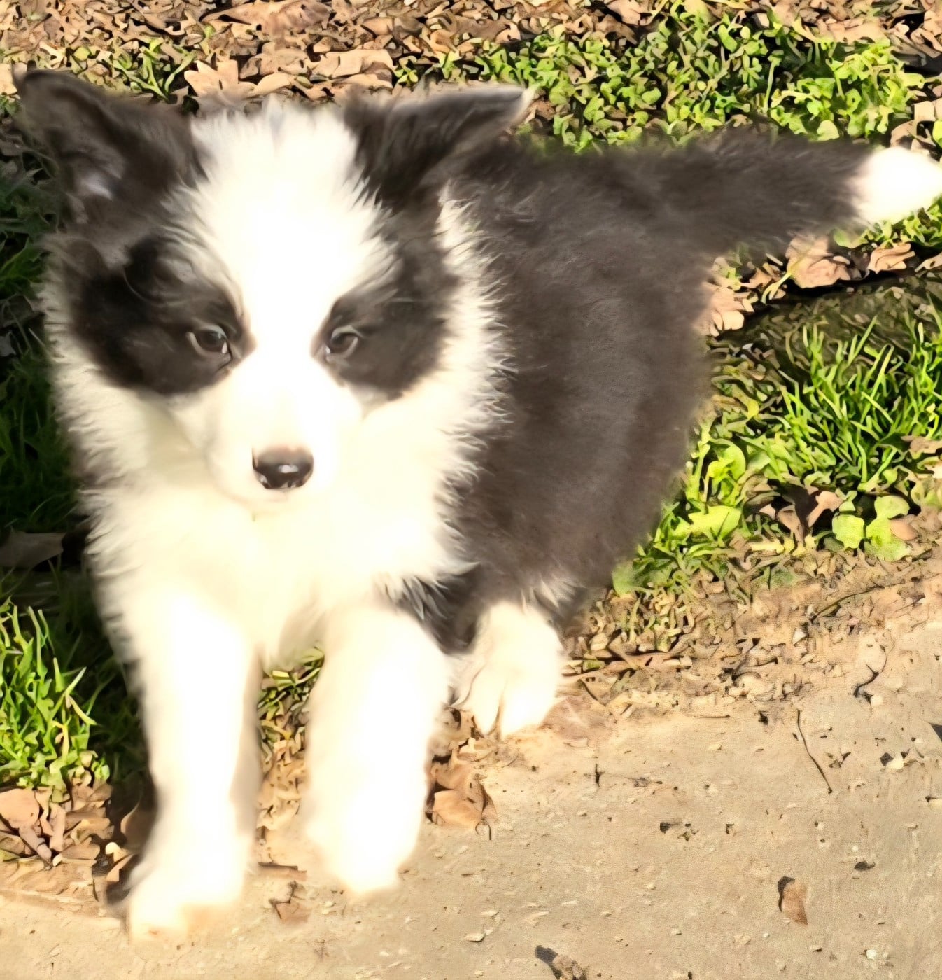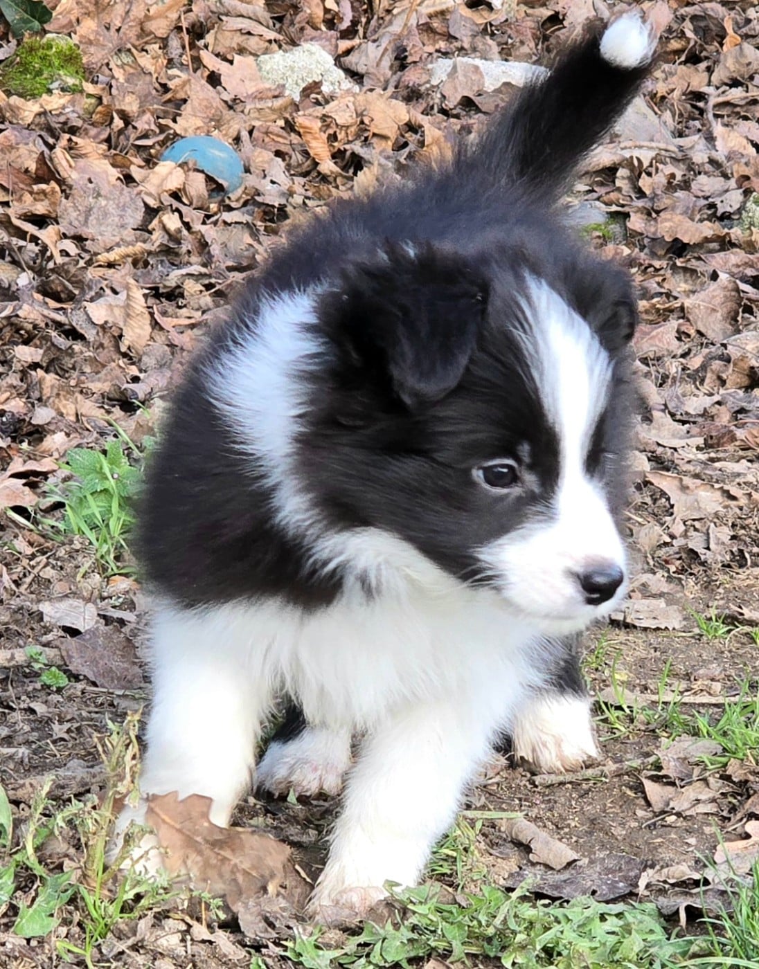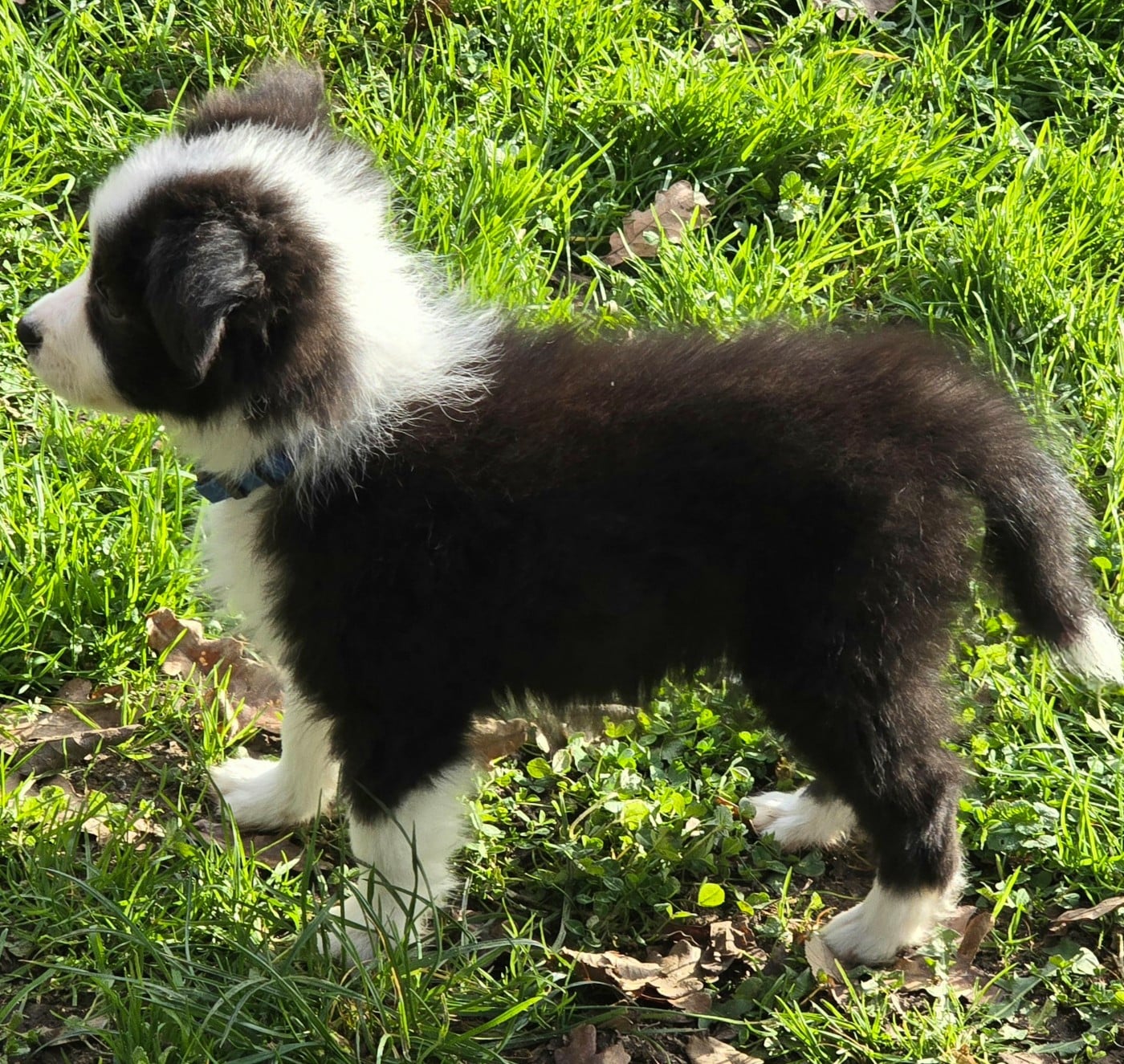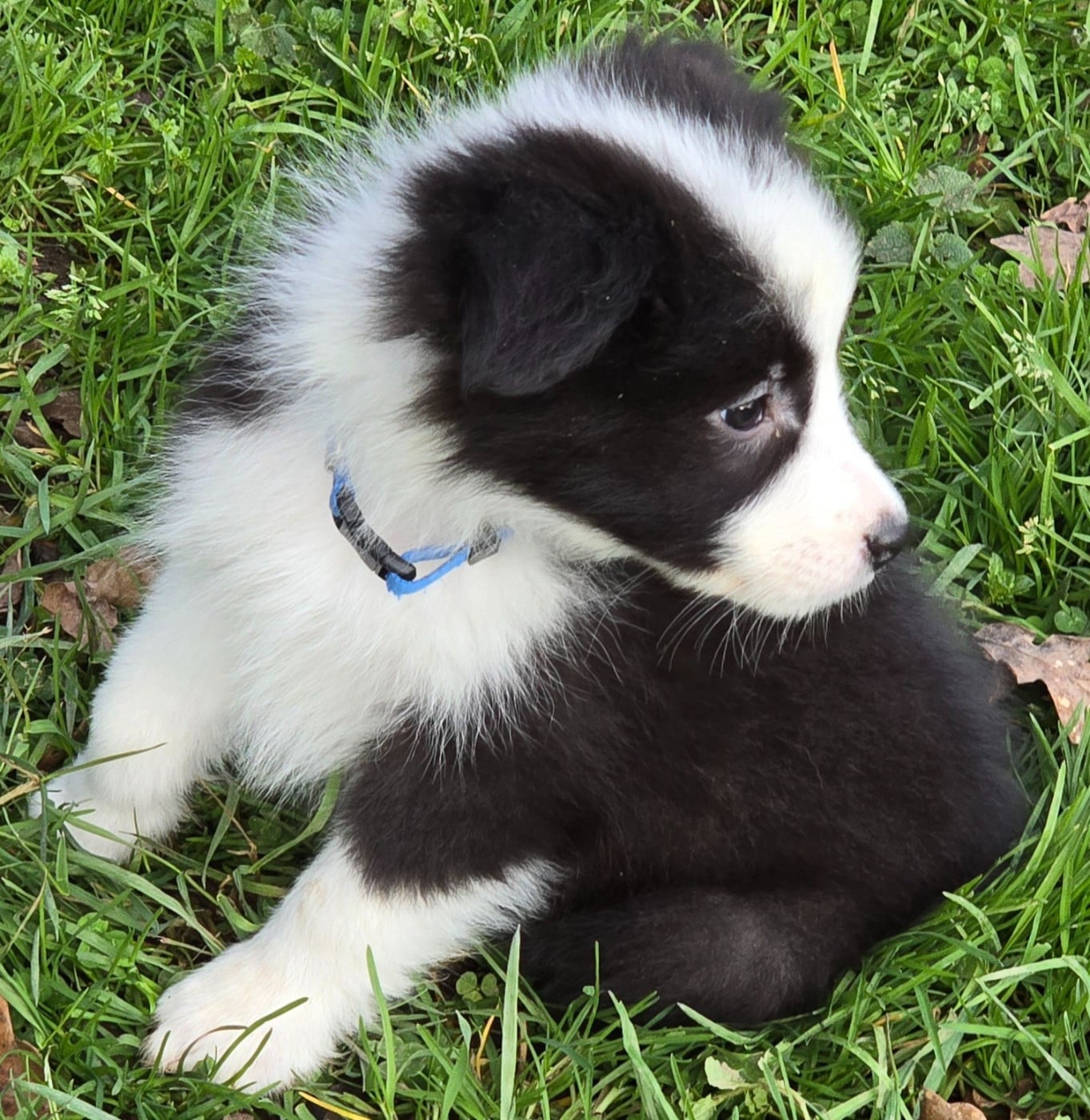 - Chiot mâle noir et blanc. Collier bleu.