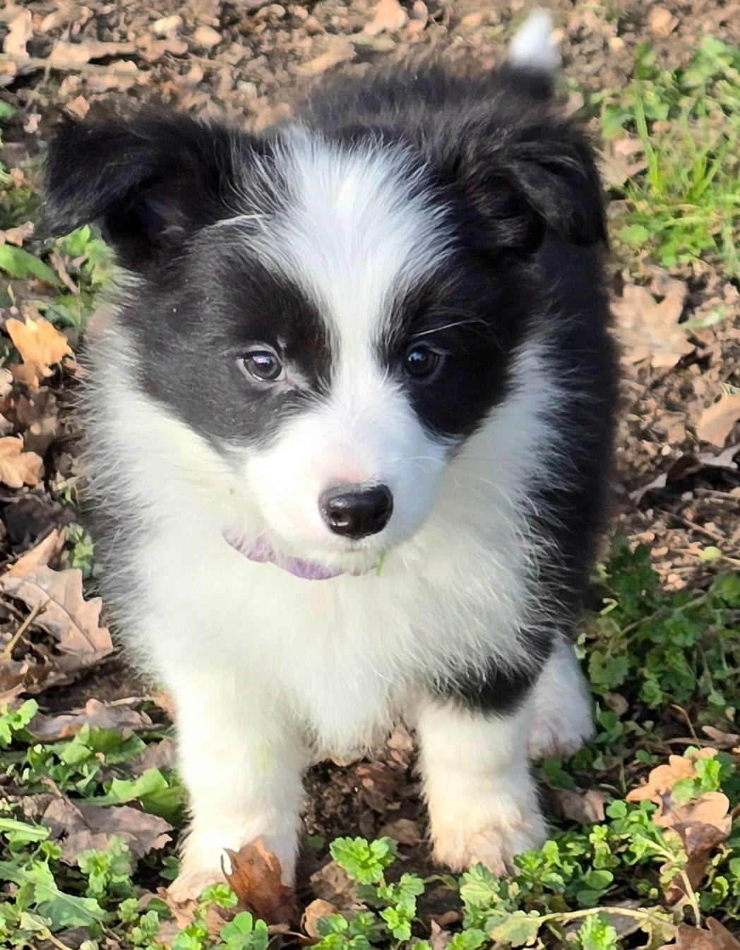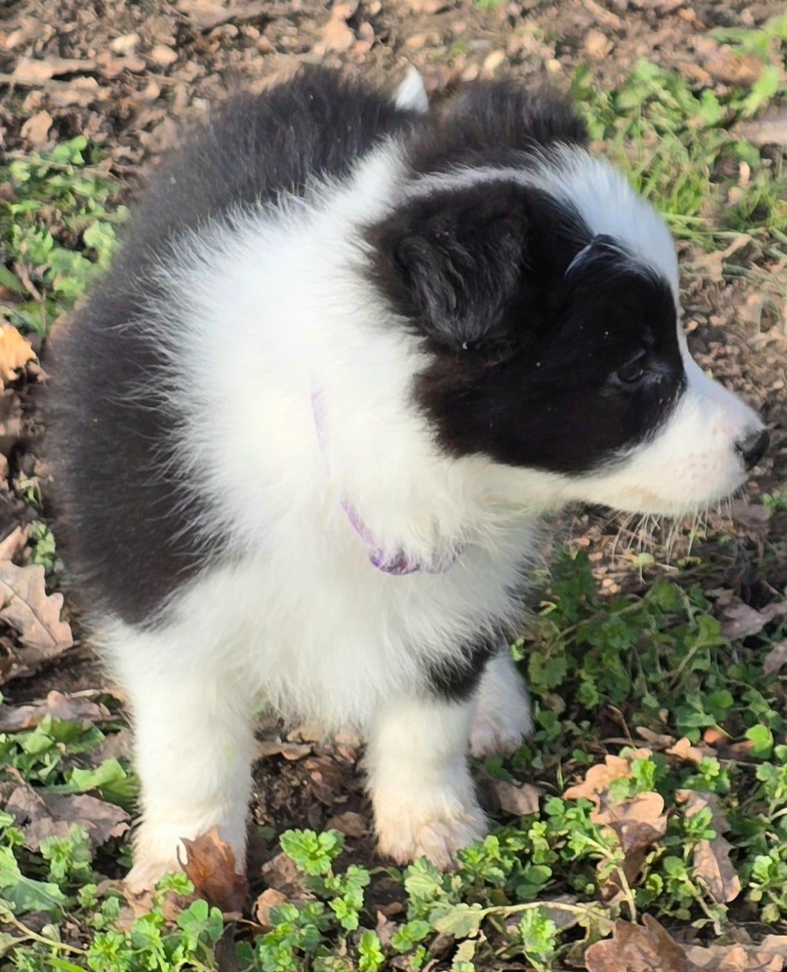 - Chiot mâle noir et blanc. Collier mauve.